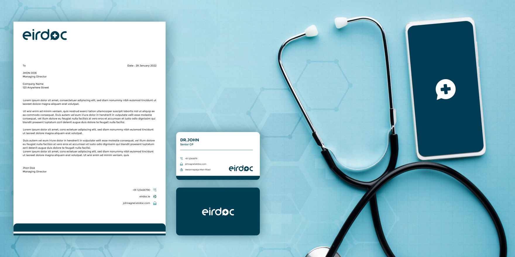 The wordmark ‘Eirdoc’ was derived from the Organo font. Also, we used text in form of a small case for the entire wordmark.