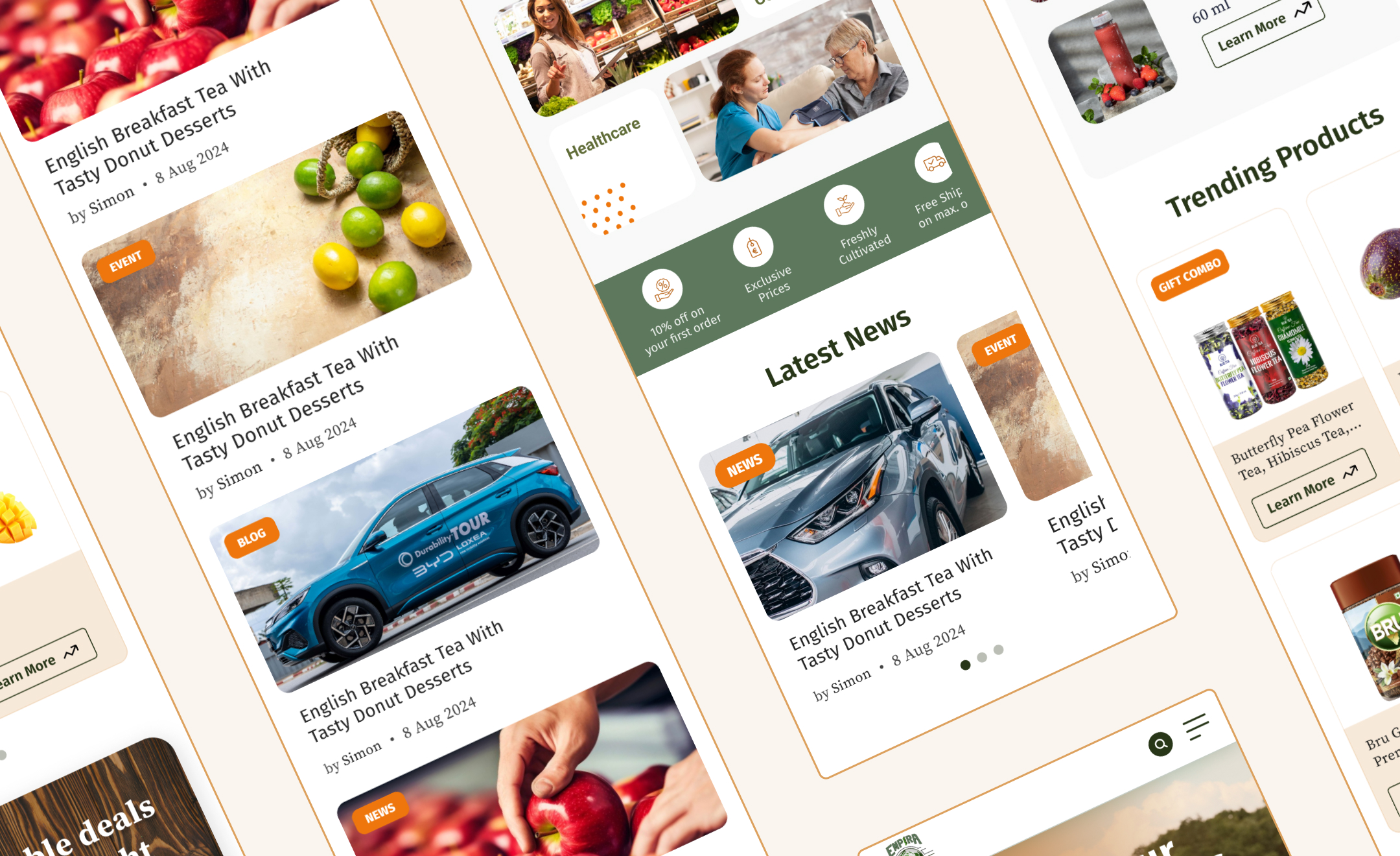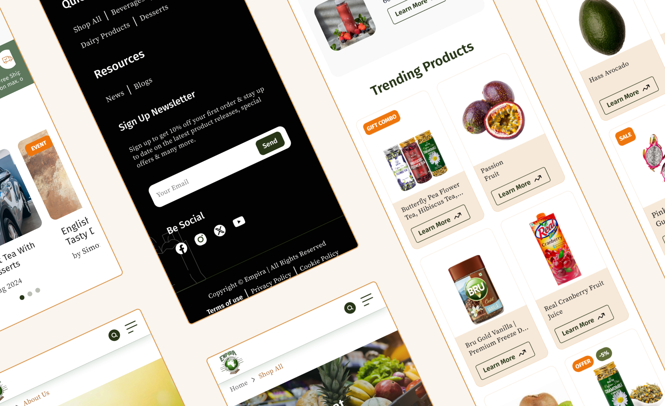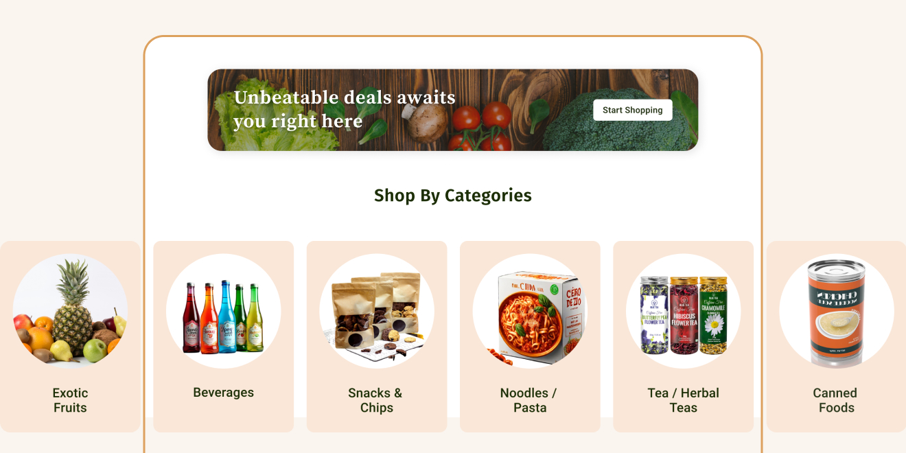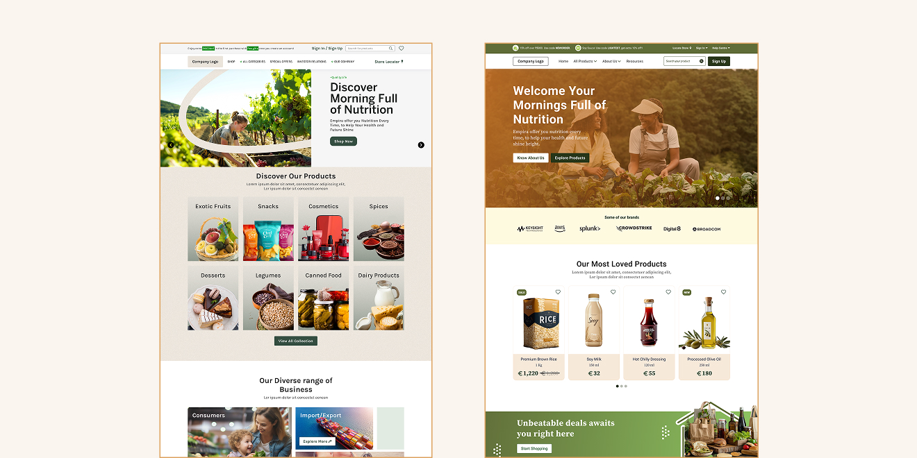 We designed high-fidelity mockups for desktop and mobile experiences, emphasizing clean layouts and effective visual storytelling. The interface makes use of dynamic banners, featured products, and categorized sections to guide users fluidly.