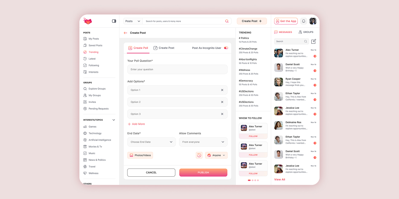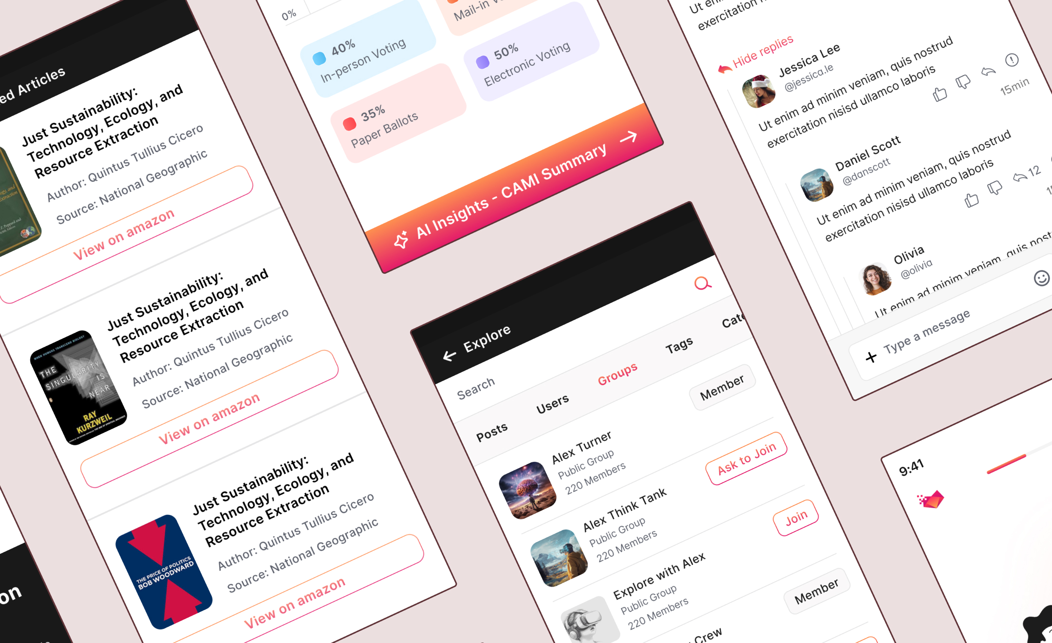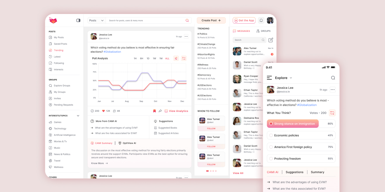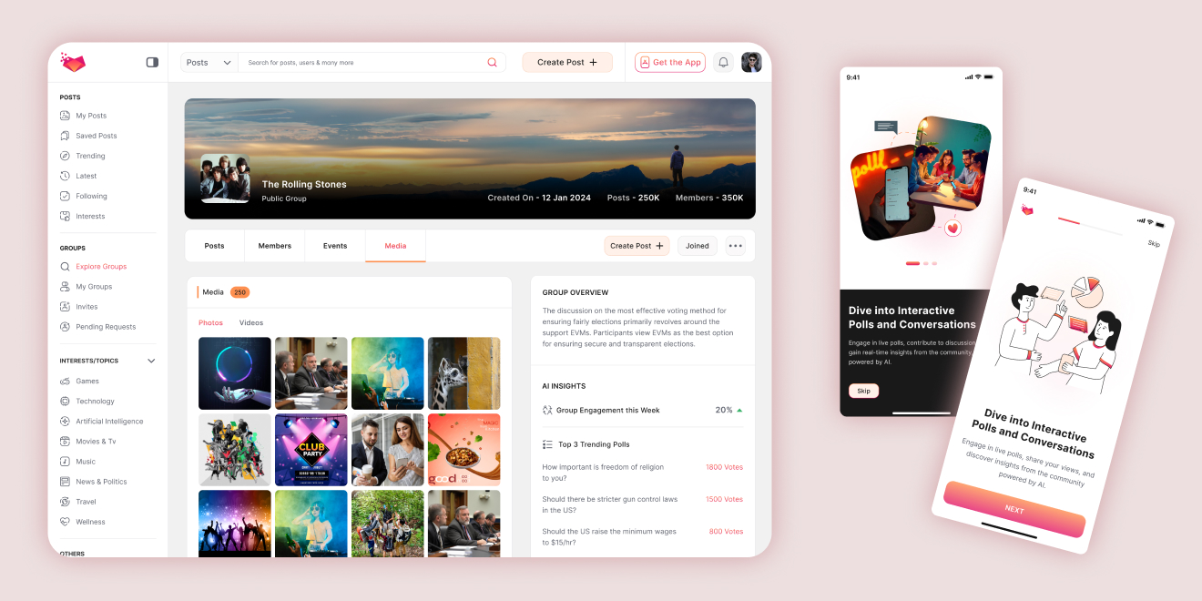 • Web UI: Adaptive layouts using grids, filters, and categories to showcase groups and polls with clarity