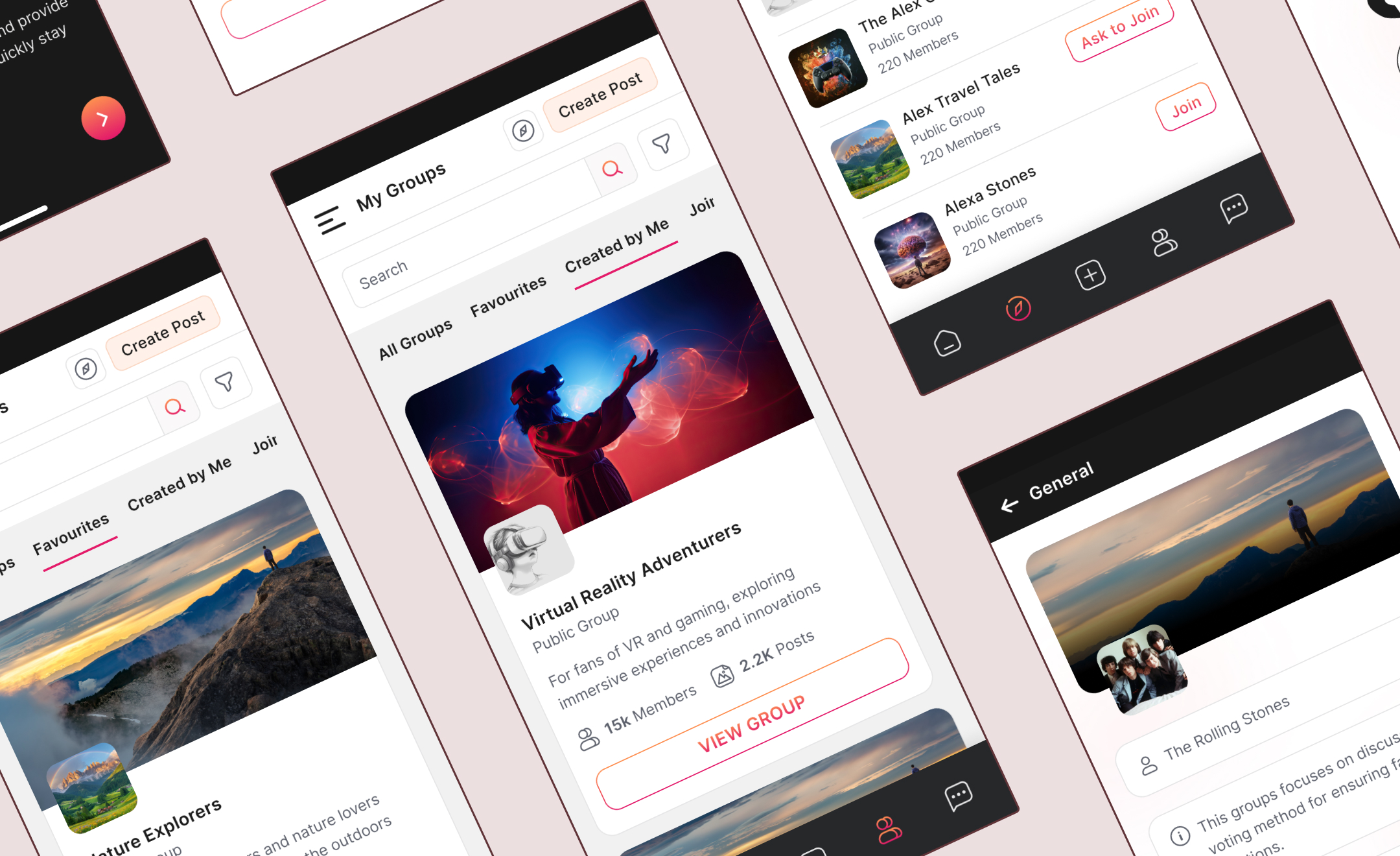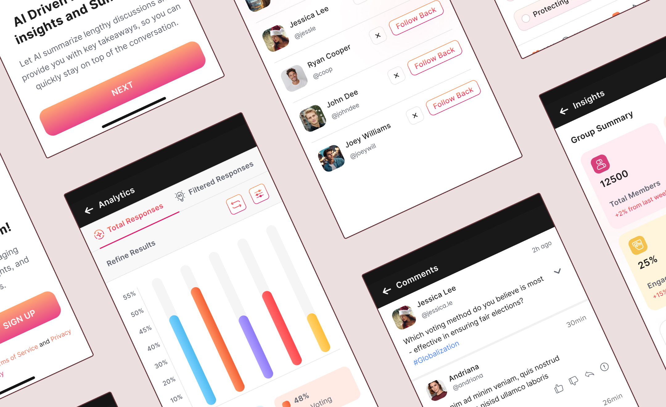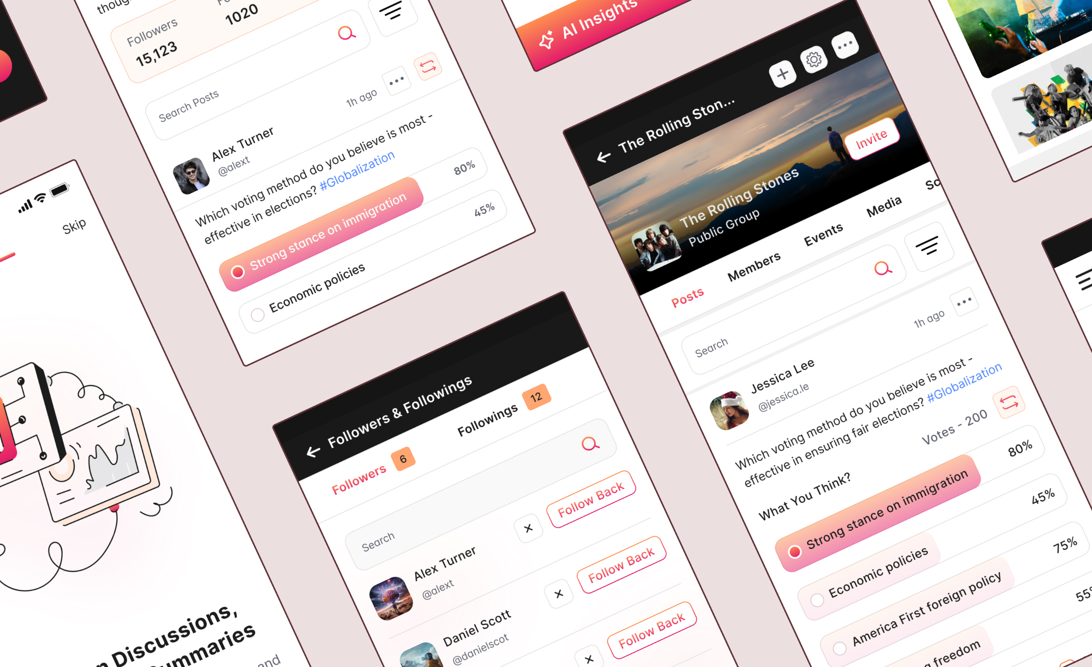 • Onboarding, Explore, Group Join, and Poll Creation Flows: Designed with simplicity and user delight in mind